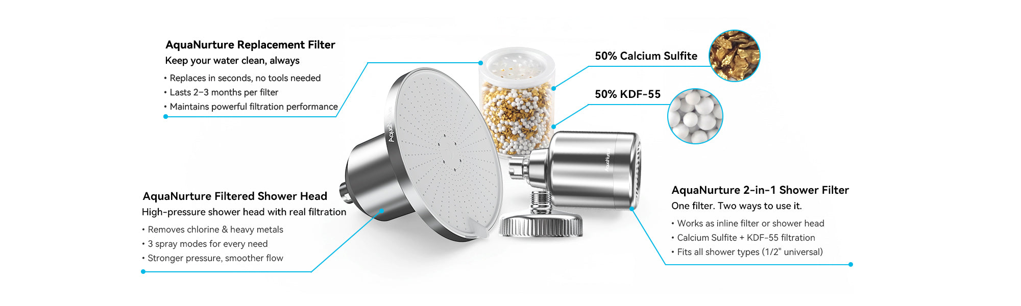 Powered by advanced Calcium Sulfite and KDF-55 filtration, AquaNurture helps remove chlorine and common impurities from your shower water. The result is cleaner, softer water that supports healthier skin and smoother, stronger hair—something you can truly feel with every shower.