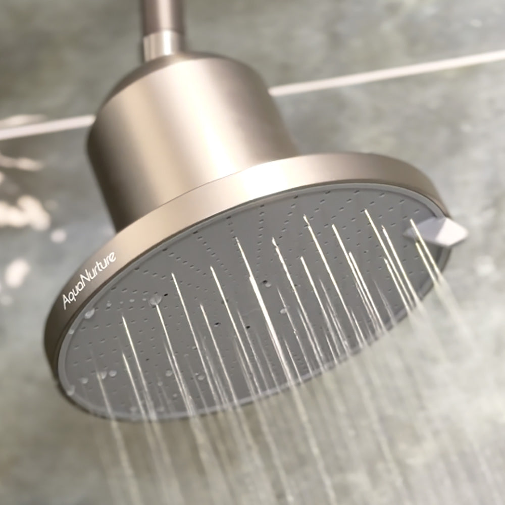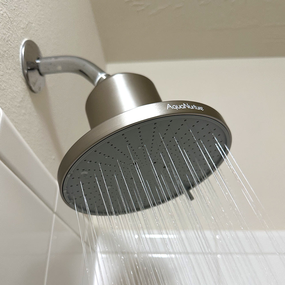 AquaNurture filtered shower head filters out chlorine, chloride, heavy metals, and other harmful impurities to improve water quality for skin and hair.