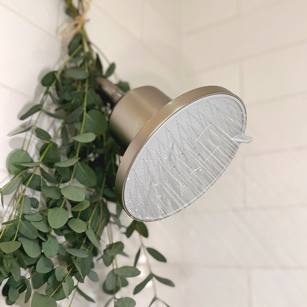 The AquaNurture filtered shower head uses a high-efficiency replacement filter filled with a blended media of KDF-55 and Calcium Sulfite.